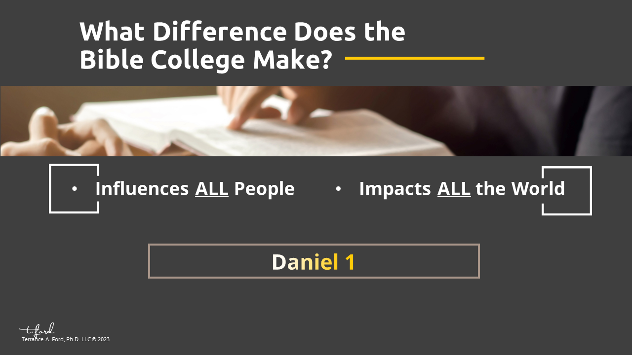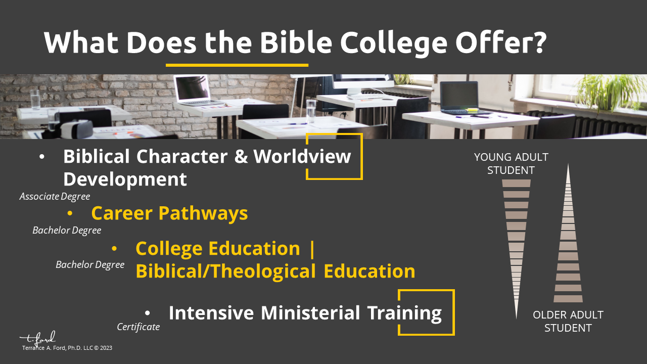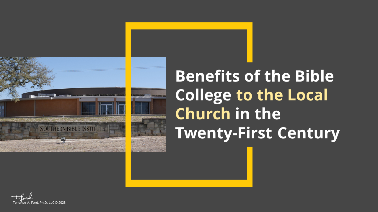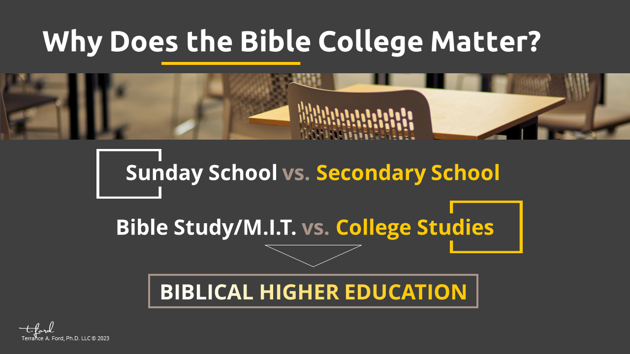 This presentation encourages a new perspective and appreciation for Biblical Higher Education institutions (commonly known as Bible Colleges).